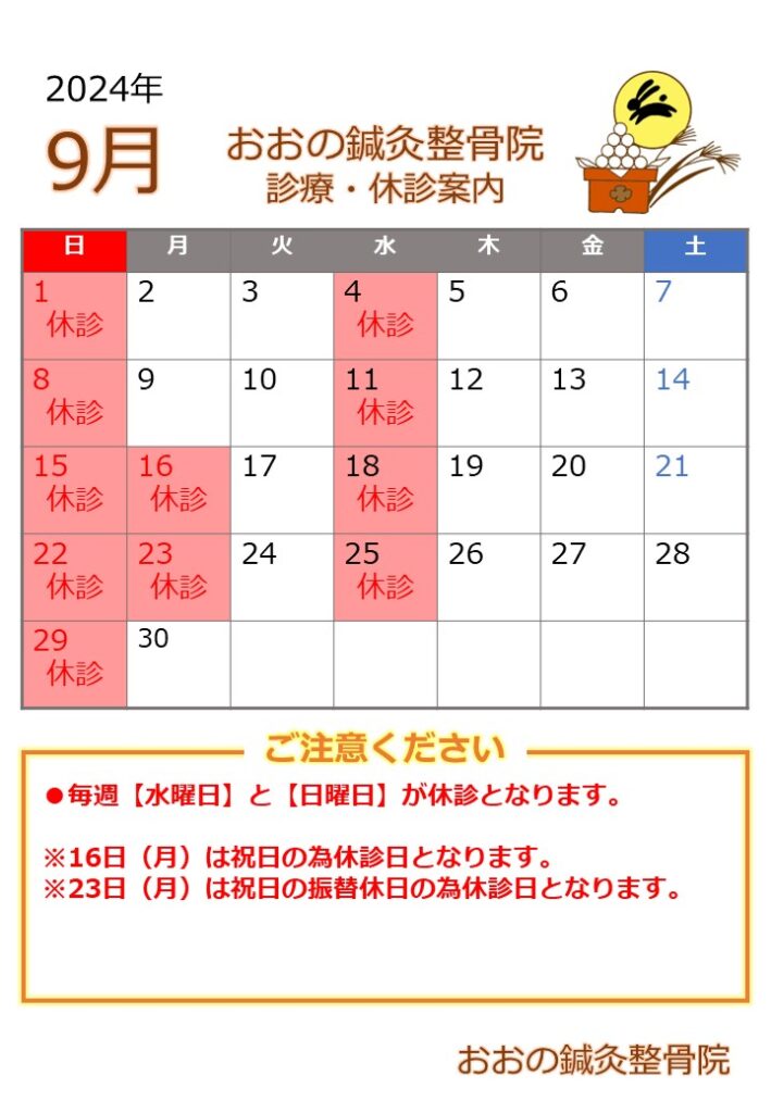 休診日のお知らせ 9月の休診日のお知らせ 2024年9月16日 2024年9月16日 admin_oono2024 9月の休診日の注意事項 毎週【水曜日】と【日曜日】が休診日となります。 16日(月)は祝日の為休診日となります。23日(月)は祝日の振替休日の為休診日となります。 ご迷惑をお掛け致しますがよろしくお願いいたします。